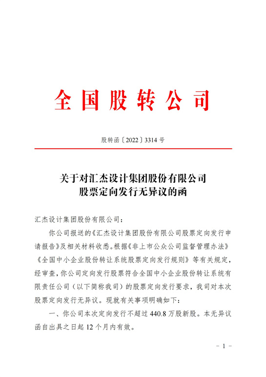 關(guān)于對(duì)匯杰設(shè)計(jì)集團(tuán)股份有限公司股票定向發(fā)行無(wú)異議的函